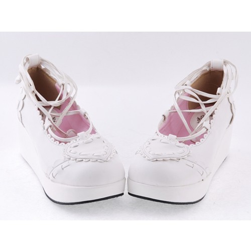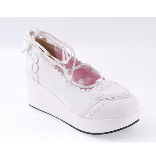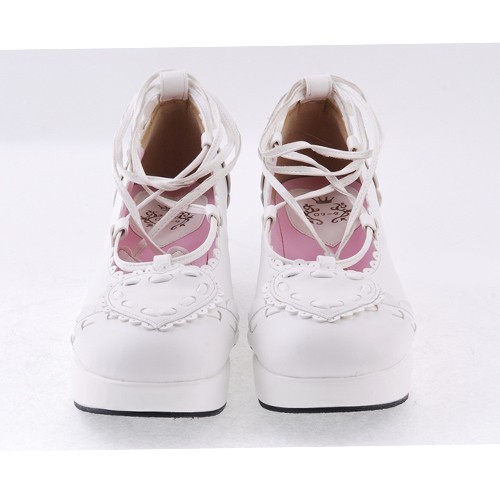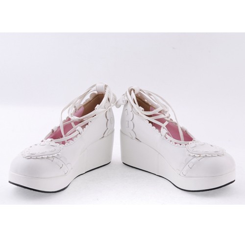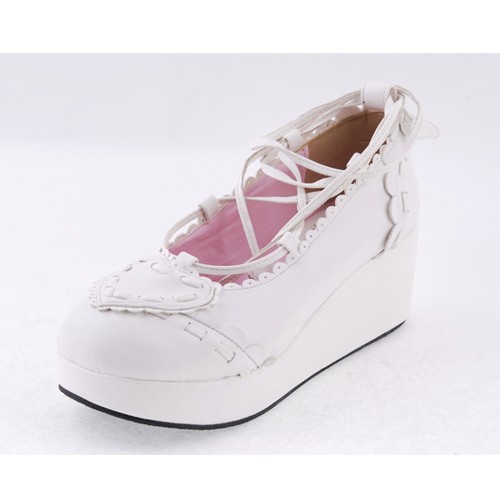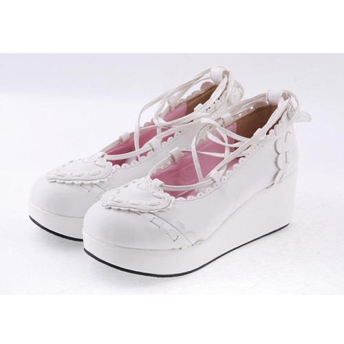 Blanc 2.4″talon haut sexy PU dentelle festonnée Tie Plate-forme filles Chaussures Lolita