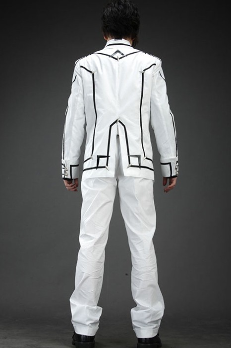 Comprend: manteau blanc, gilet blanc, chemise noire, pantalon blanc, cravate rouge
