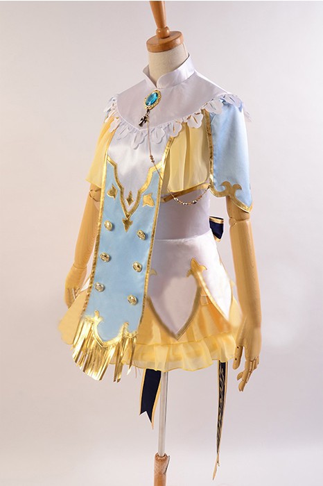 Caractéristiques: Matériel comprennent uniforme tissu, tricot, mousseline de soie et others.Type de la jupe est plissée. Il y a une grande gemme bleue sur la chemise.