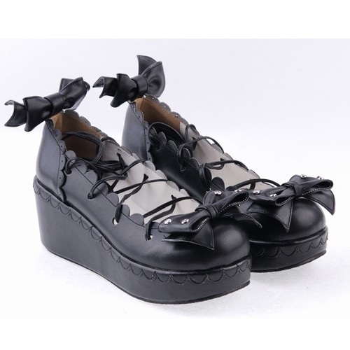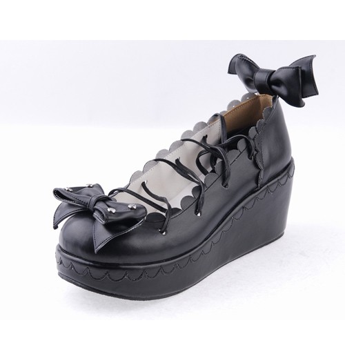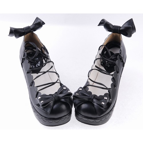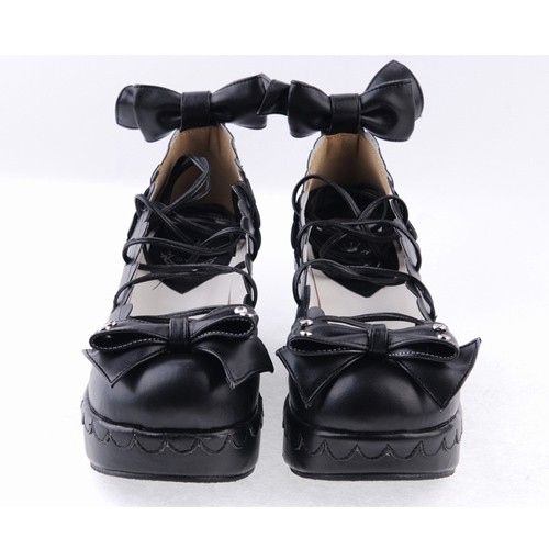 Noir 2.8″talon haut de Charme en cuir verni festonnée avec nœud et filles Chaussures Lolita