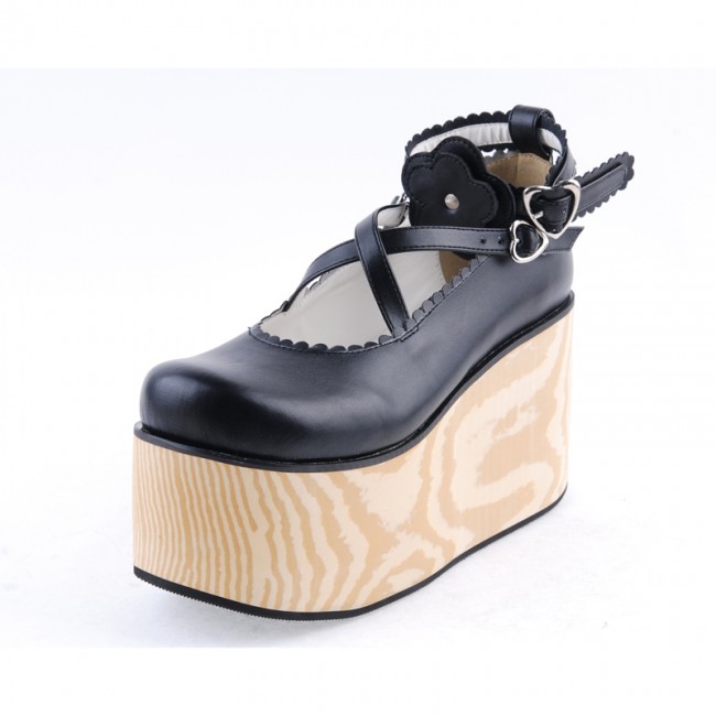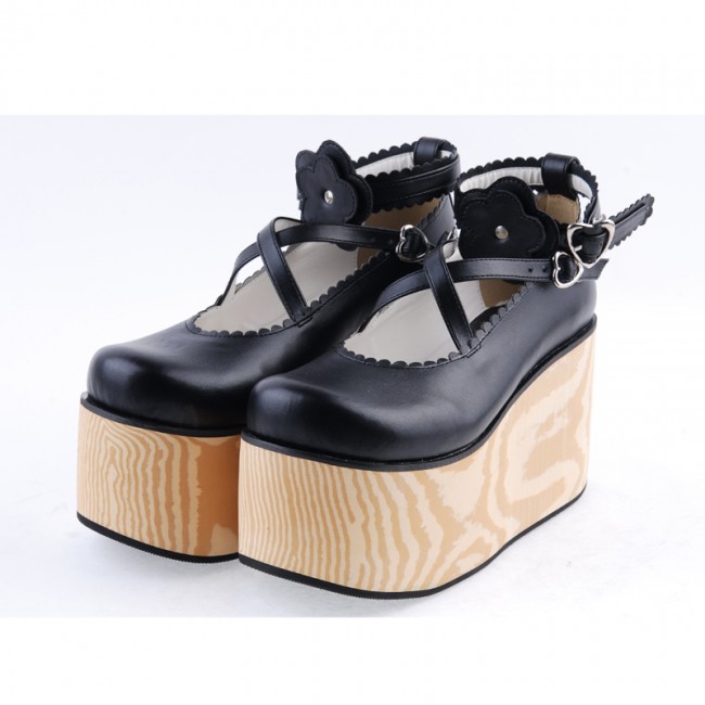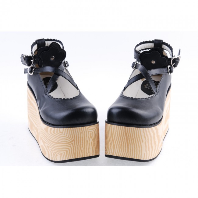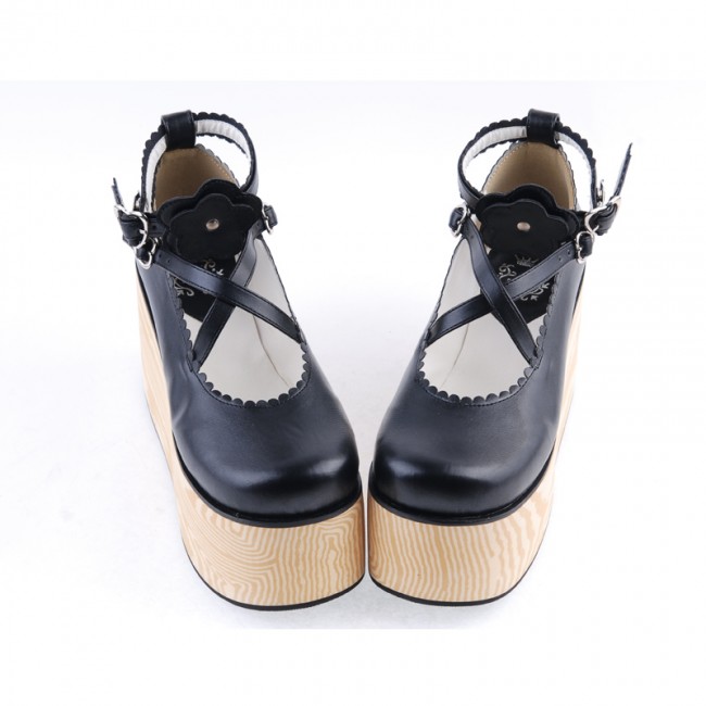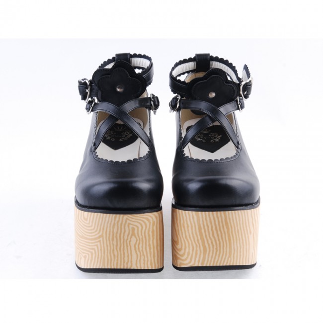 Home Lolita Lolita Footwear Noir 3,9″ talon haut en cuir verni Belle Croix Straps Fleur Décoration Plateforme Filles Chaussures Lolita LF0060