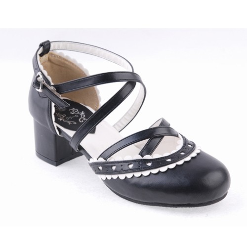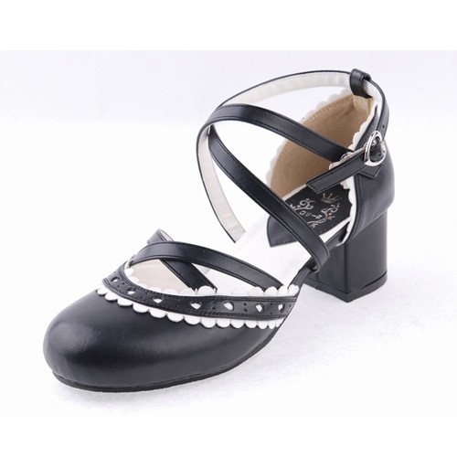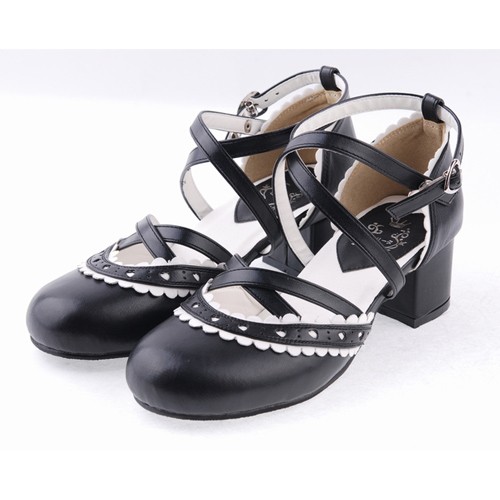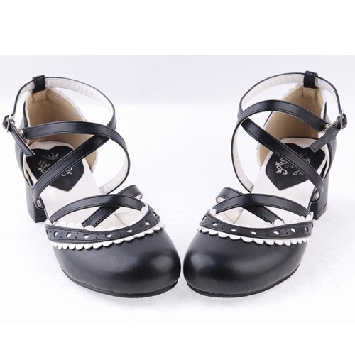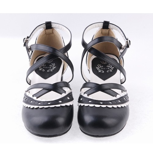 Noir et blanc 2.6″haut talon Belle PU bout rond Criss Cross bretelles festonnée plate filles Chaussures Lolita