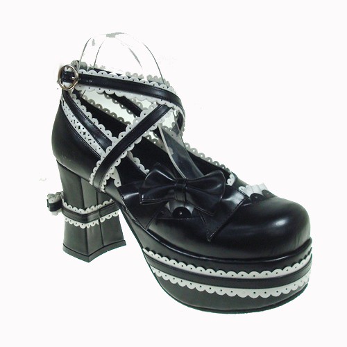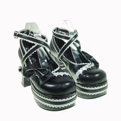 Noir et blanc 3.7″talon haut Glamorous polyuréthane bout rond lanières croisées plate-forme Lady Lolita