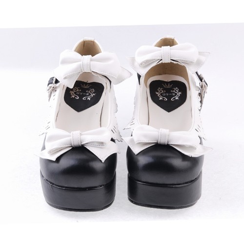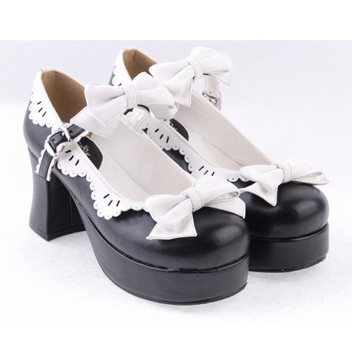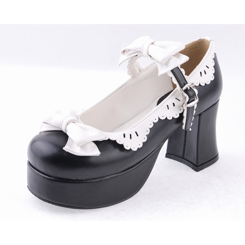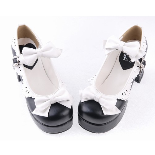 Noir et blanc 3″talon haut élégant ronde polyuréthane Toe Strap Bow Décoration Plateforme Filles Chaussures Lolita