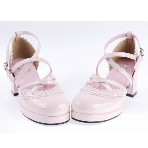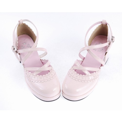 Home Lolita Lolita Footwear Rose 2.6″ ronde de haut talon sexy en cuir synthétique Toe Criss Cross Straps festonnée Plateforme Filles Chaussures Lolita LF0039