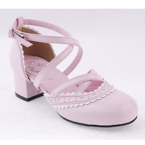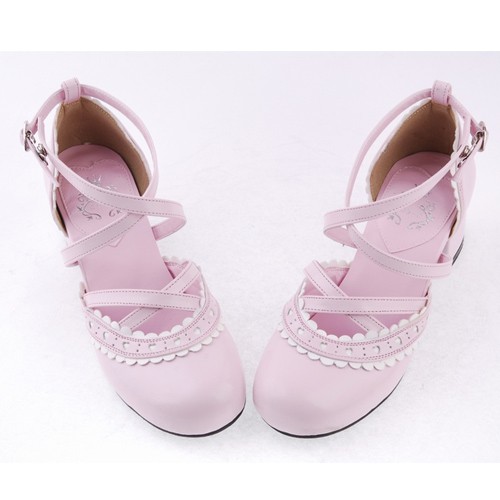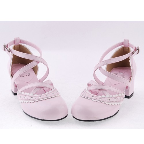 Rose et blanc 2.6″talon haut Glamorous polyuréthane bout rond Criss Cross Straps festonnée Plate-forme filles Chaussures Lolita