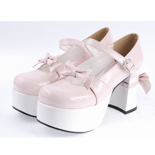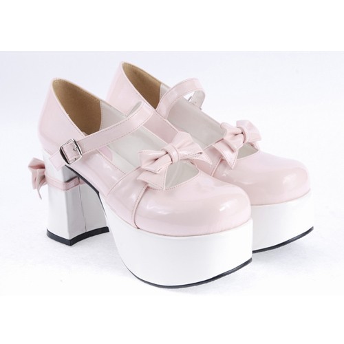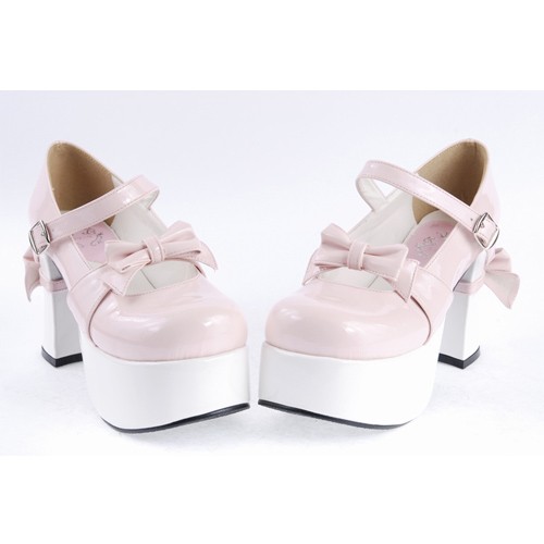 Rose et blanc 3.7″talon haut Adorable synthétique bout rond en cuir Bracelet Bow Décoration Plateforme Filles Chaussures Lolita