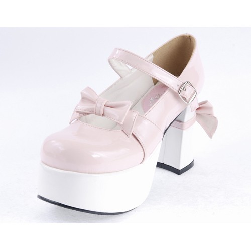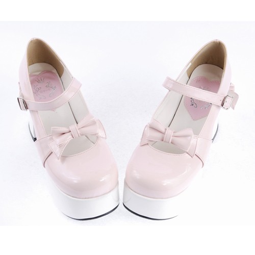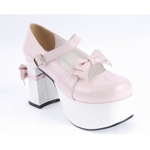 Home Lolita Lolita Footwear Rose et blanc 3.7″ talon haut en cuir synthétique adorable bout rond Bracelet Bow Décoration Plateforme Filles Chaussures Lolita LF0031